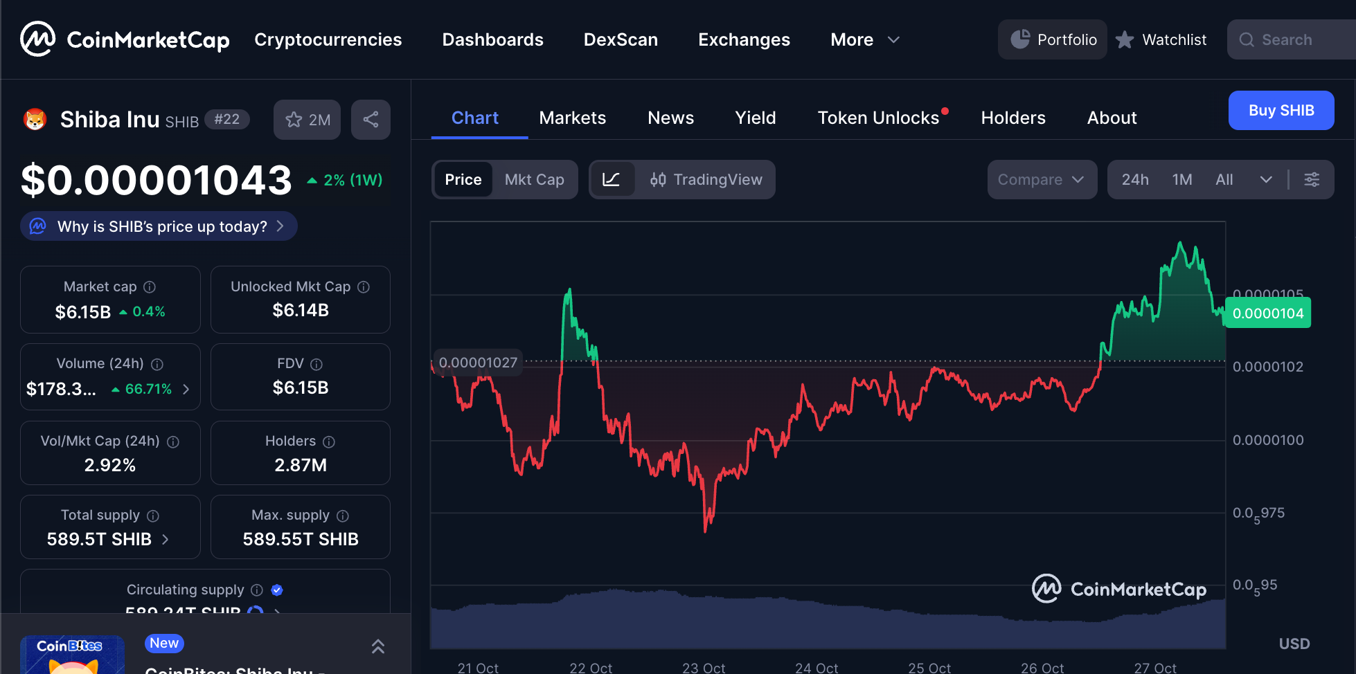 As of October 27, 2025, Shiba Inu trades around $0.000010–$0.000011 with a market cap near $6.1B and circulating supply of roughly 589 trillion SHIB. Volumes have been fluctuating in the low–hundreds of millions over the past 24 hours, reflecting steady but not euphoric activity.