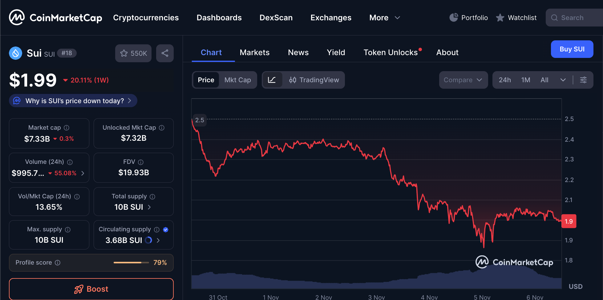 SUI trades around the $2 mark, ranking in the top 20 by market cap with several billion dollars in circulating value and a max supply of 10B. Check a live dashboard for the latest SUI price prediction, market cap, and circulating supply details (they move constantly during the day).