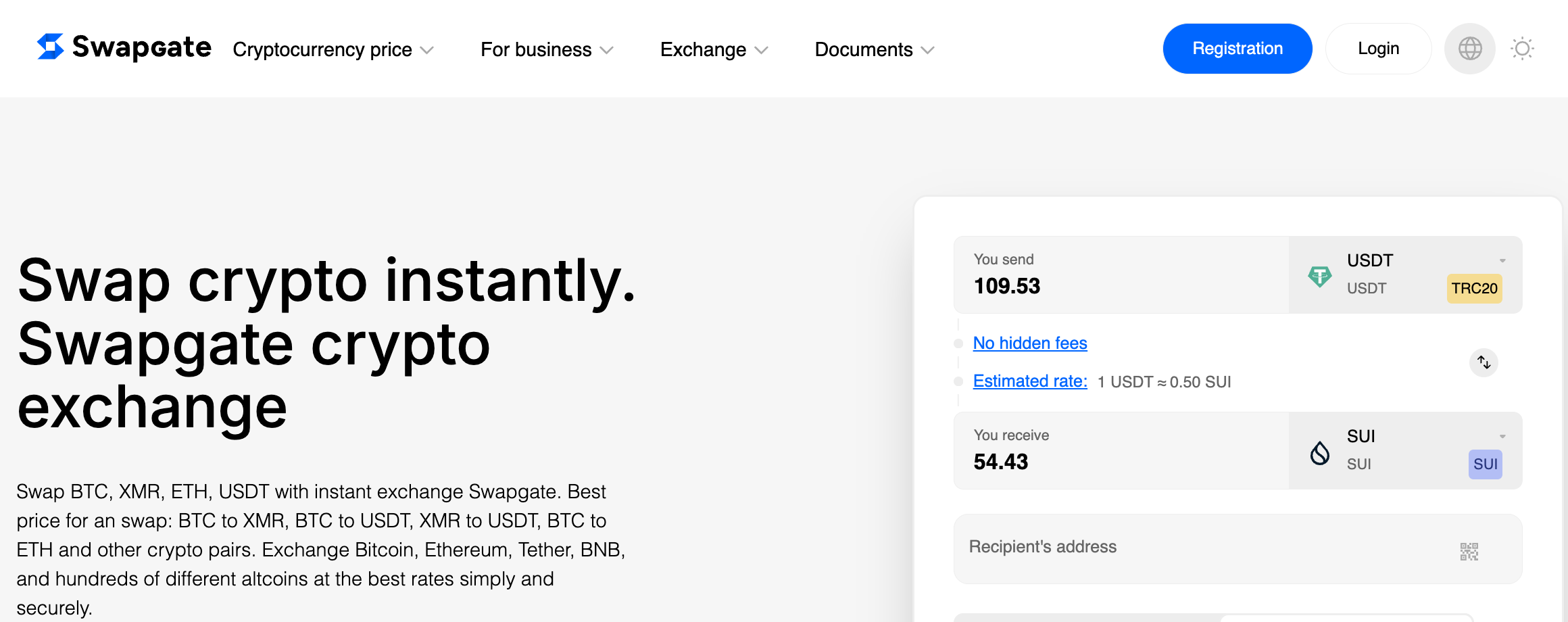 - Open Swapgate.io and pick your pair (e.g., USDT → SUI). The widget lets you choose Floating (tracks the market) or Fixed (locks the output for a short window).