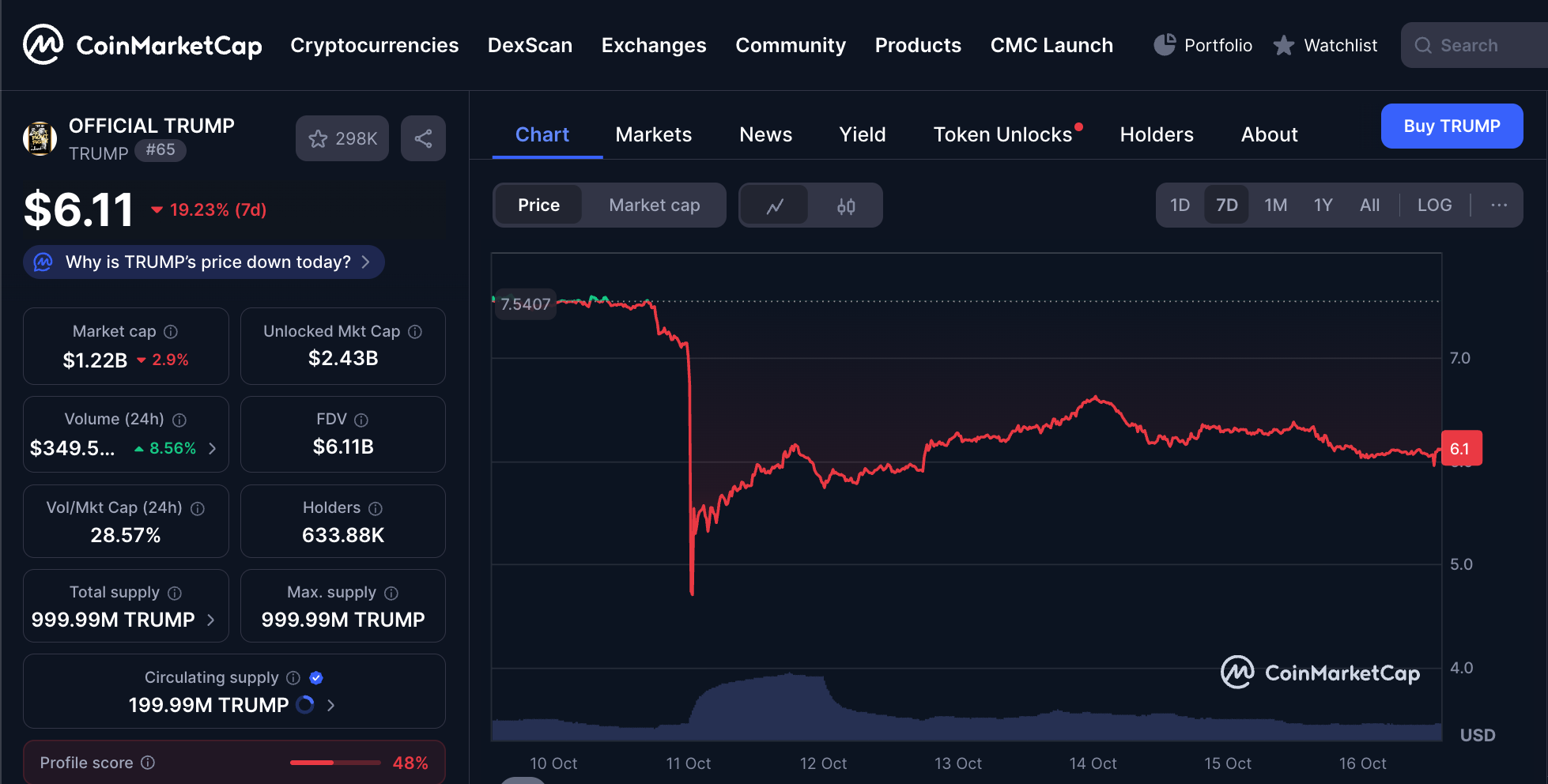 По состоянию на 16 октября 2025 года Official TRUMP торгуется в районе середины $6, с 24-часовым объёмом около $300 млн. На живой странице CoinMarketCap показана рыночная капитализация около $1,2 млрд, циркулирующее предложение около 200 млн TRUMP и максимальное предложение чуть менее 1 млрд TRUMP. Используйте CMC (или CoinGecko) для текущей цены и списка площадок, так как цифры меняются в течение дня.